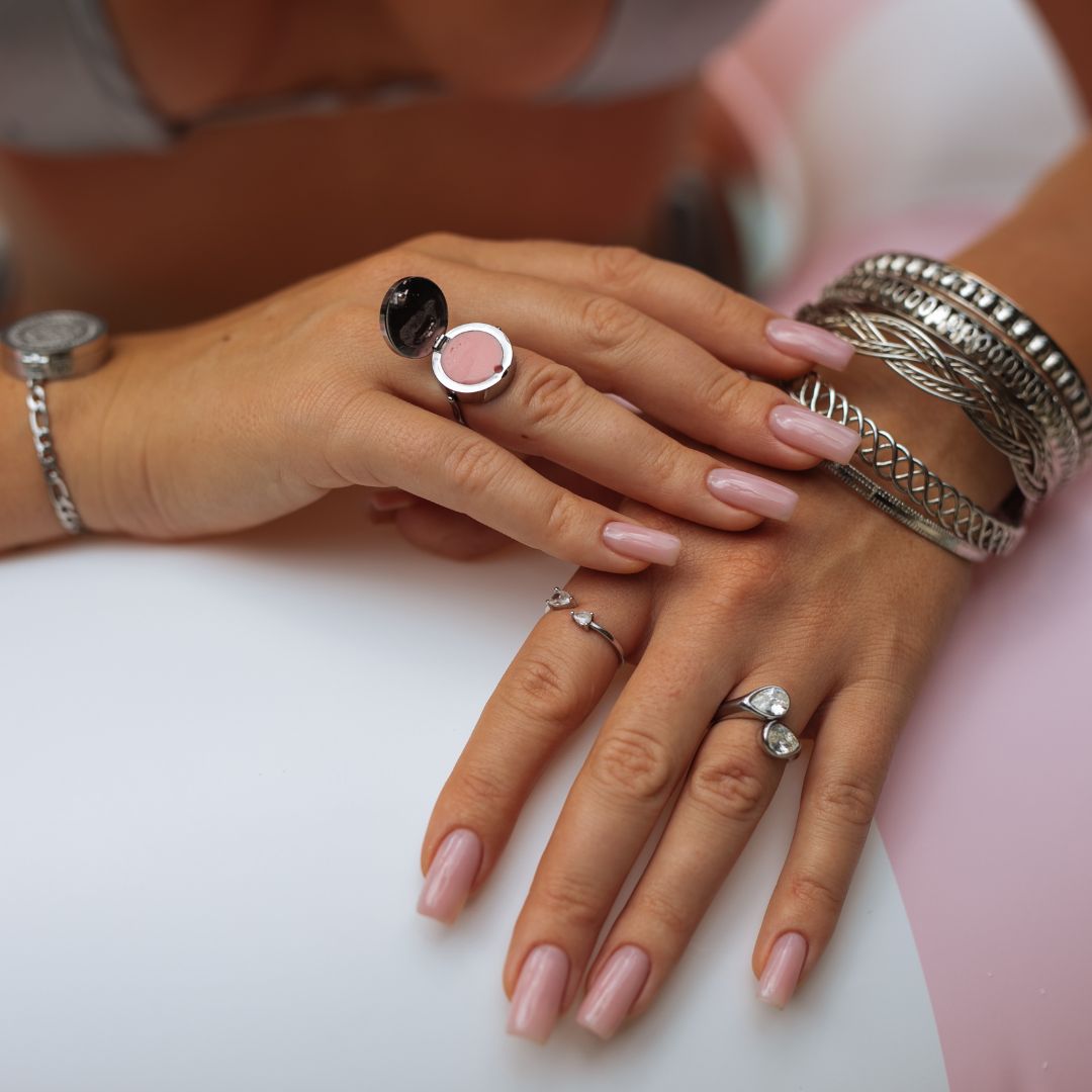 Fall in love with our Pink Heart Lip Balm Ring, the perfect blend of playful charm and subtle glamour. With its radiant heart-shaped stone, this accessory is more than just jewelry — it secretly keeps your favorite lip balm right at your fingertips. Available in stainless steel and 14K gold finishes, the Pink Heart Ring adds a sweet, feminine touch while keeping your lips perfectly nourished.