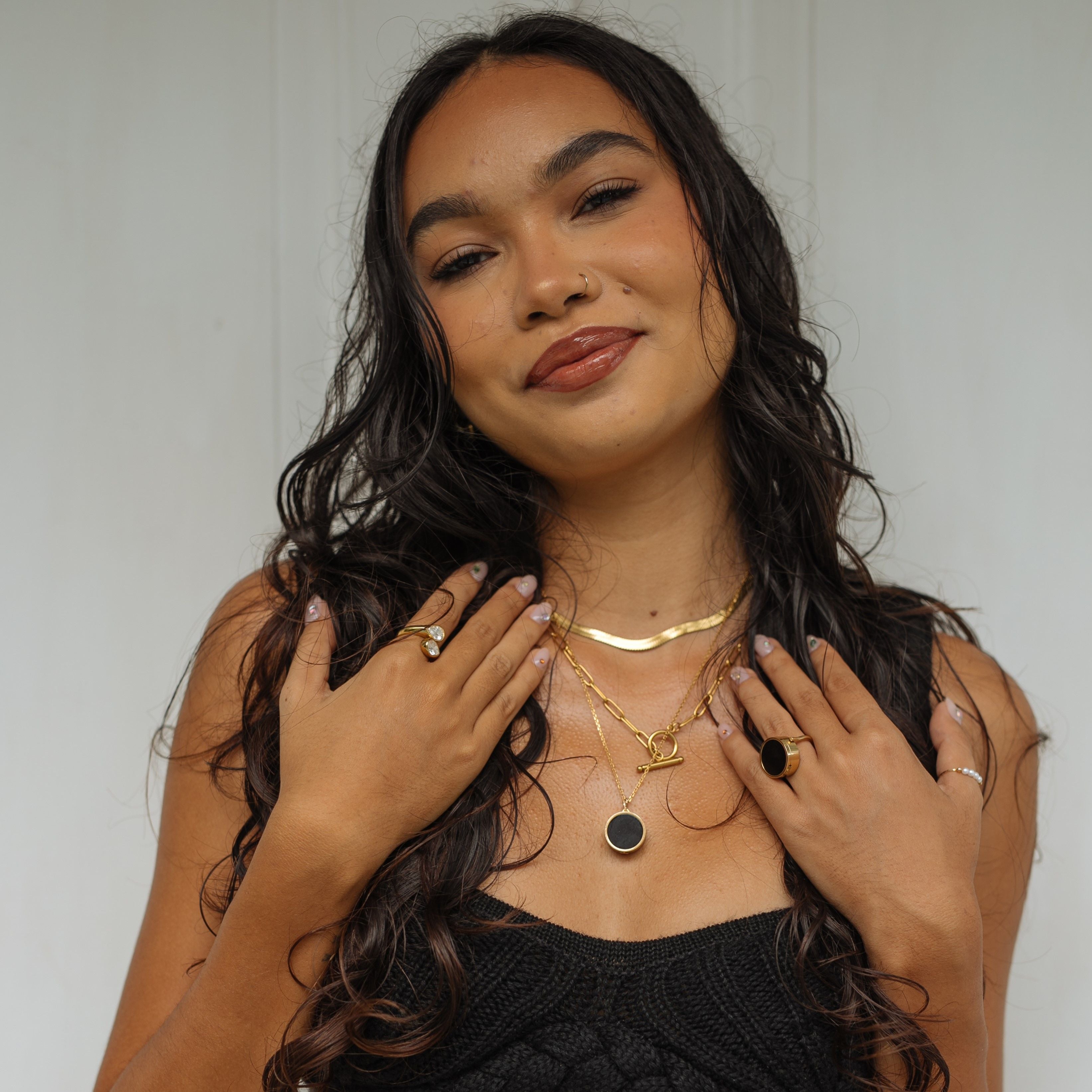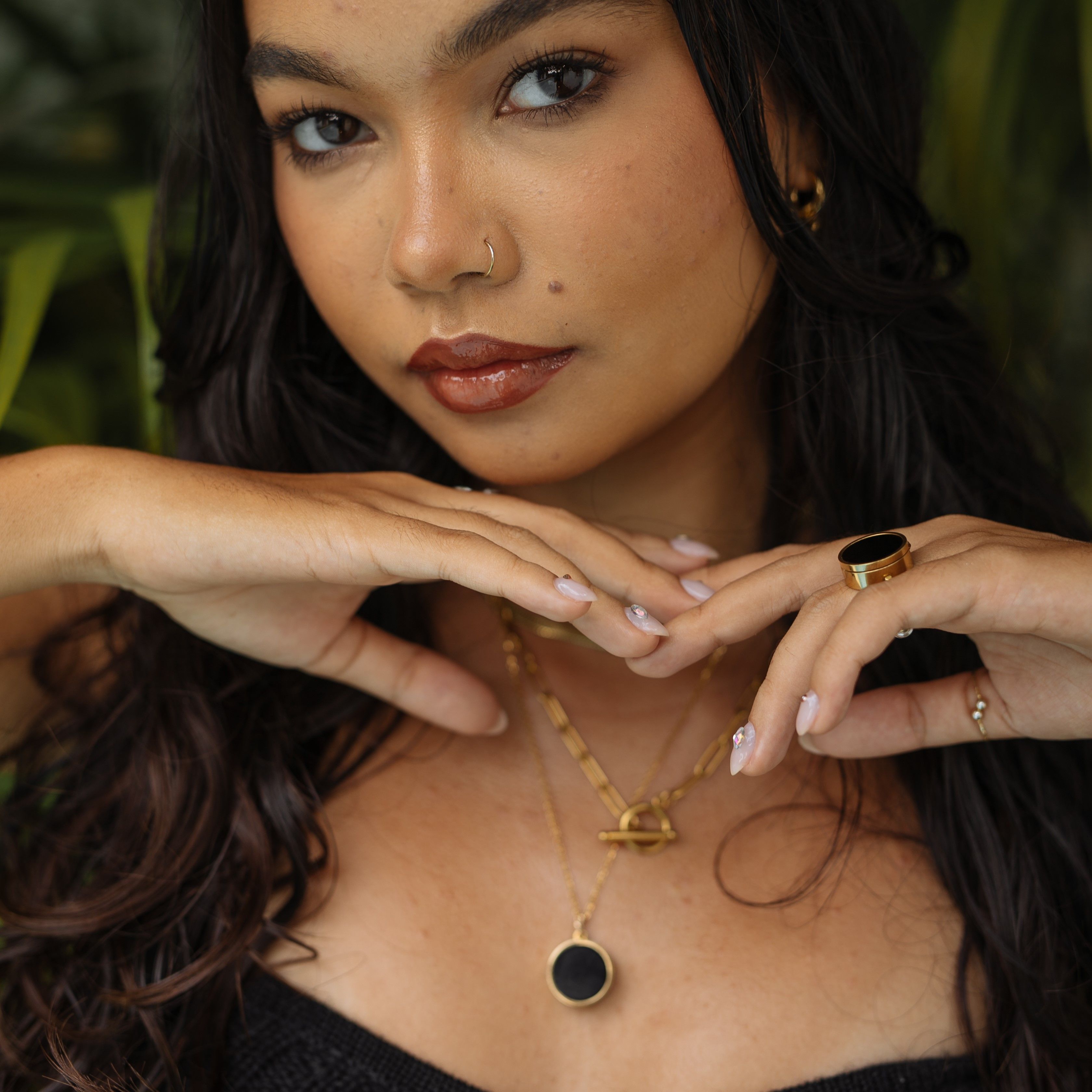 Minimal, bold, and secretly practical — the Black Onyx Lip Balm Necklace is your new everything necklace. Designed with a jet-black center and set in gold or stainless steel, it’s a classic piece with a hidden surprise inside. One twist gives you instant access to your lip balm. No digging, no mess — just sleek style and soft lips, wherever you are. Perfect for coffee runs, commutes, or nights out when a bag isn’t even part of the plan. It’s like your favorite black outfit… but shinier.