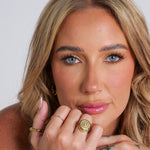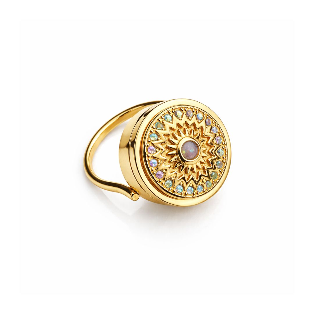 Meet Paris. She’s radiant, a little vintage, and totally unforgettable. This gold-tone lip balm ring features a luminous opal-style center stone, framed by a bold sunburst and a halo of iridescent shimmer. But she’s more than just a pretty face—Paris opens with a discreet clasp to reveal your favorite lip balm inside.